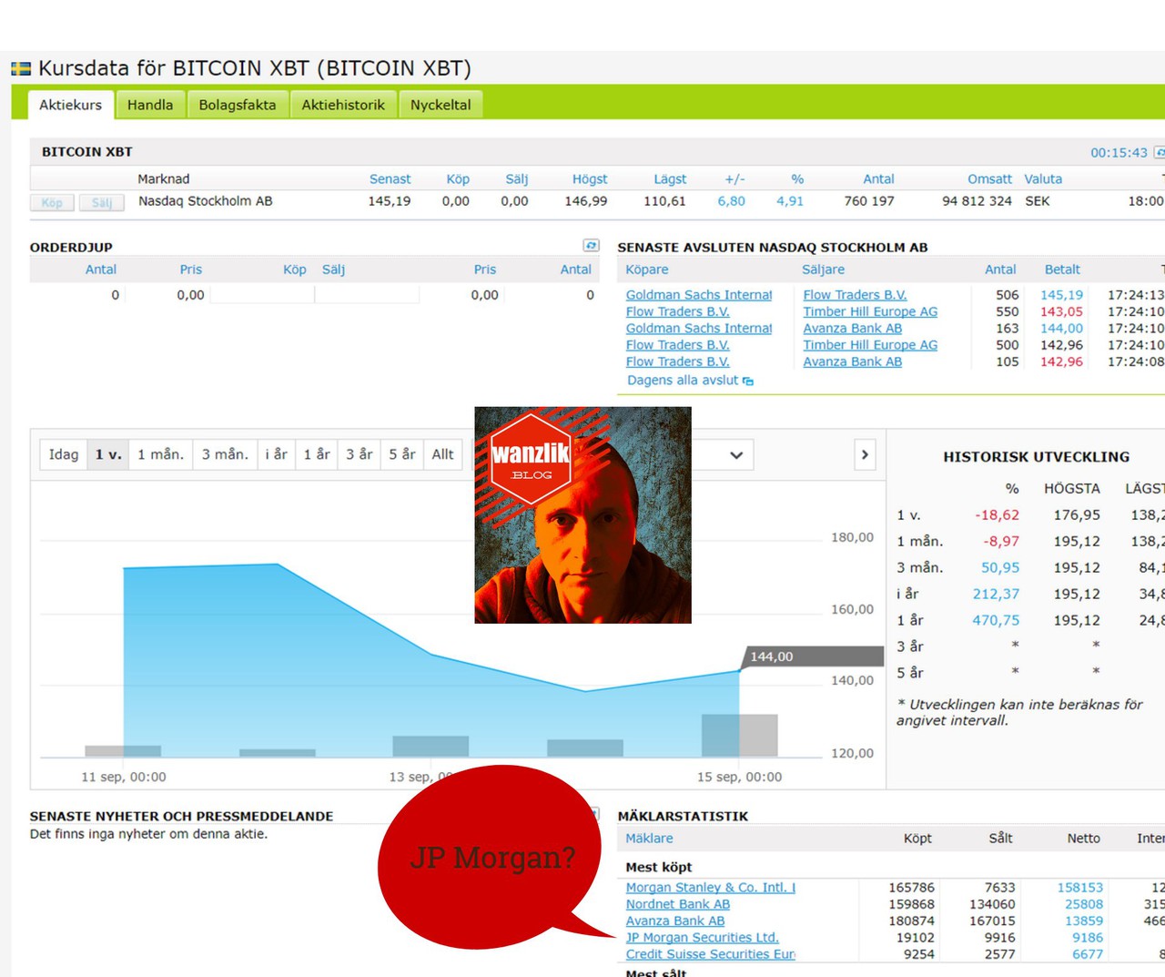 Dort fand ich dann folgenden Chart aus der NASDAQ Stockholm (Börse). Dieser Chart zeigt den Handel von Bitcoin an dieser Börse. An dieser Börse wird aber nicht direkt in Bitcoin gehandelt, sondern ein Dienstleister eingeschaltet. Dieser Dienstleister ist die Firma XBT Provider aus Schweden Der unter der Schwedischen Börsenaufsicht ein synthetisches Derivat auf den Bitcoin arrangiert hat. Das Derivat kann man nun in Stockholm handeln.