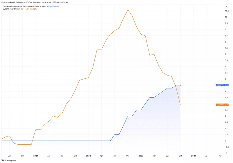 Von 0 auf 100 – Die EZB macht Ernst!Vom gemütlichen Nullzins bis hin zu schwindelerregenden 4,50 % beim Leitzins und von einem kühlen -0,5 % auf warme 4,00 % beim Einlagenzins – die Europäische Zentralbank hat in gut einem Jahr eine Zinserhöhung hingelegt, die sich gewaschen hat! 📈 Aber Moment, das ist noch nicht alles, denn die Inflation in Europa scheint sich zu beruhigen. Die Märkte, schlau wie sie sind, wittern schon, dass die Zinsen vielleicht bald wieder fallen könnten. 🧐
